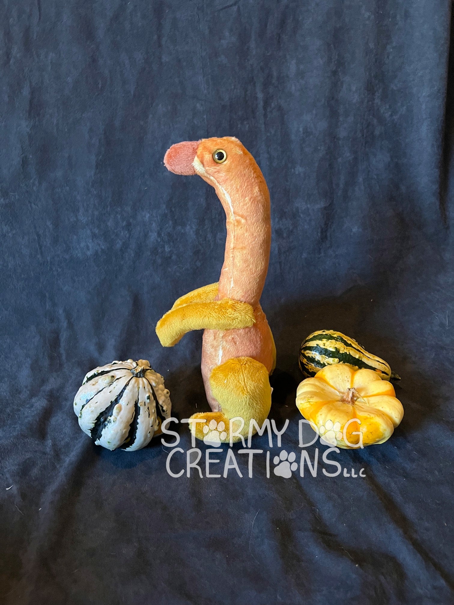 Whether you call this one-of-a-kind creature a Gourd Goose or a Squash Duck, this gourd monster will brighten your day with its cuteness. This one was inspired by little gourds with their long necks and bodies. The squash colorations are designed by hand and printed directly onto the plush fabric.